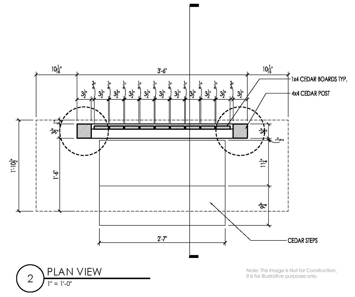 The shrine will be constructed entirely from Western Red Cedar. Its form is simple, two 4×4 posts supporting a 12/12 Cedar shake roof. The roof sits upon two projecting beams supported by Cedar brackets. The elevation of the bearing point of the rafters, is set by a 3:5 proportion of the width of the shire. The bottom horizontal support dimension down from the rafter bearing is a 1:1 proportion to the width of the shrine.